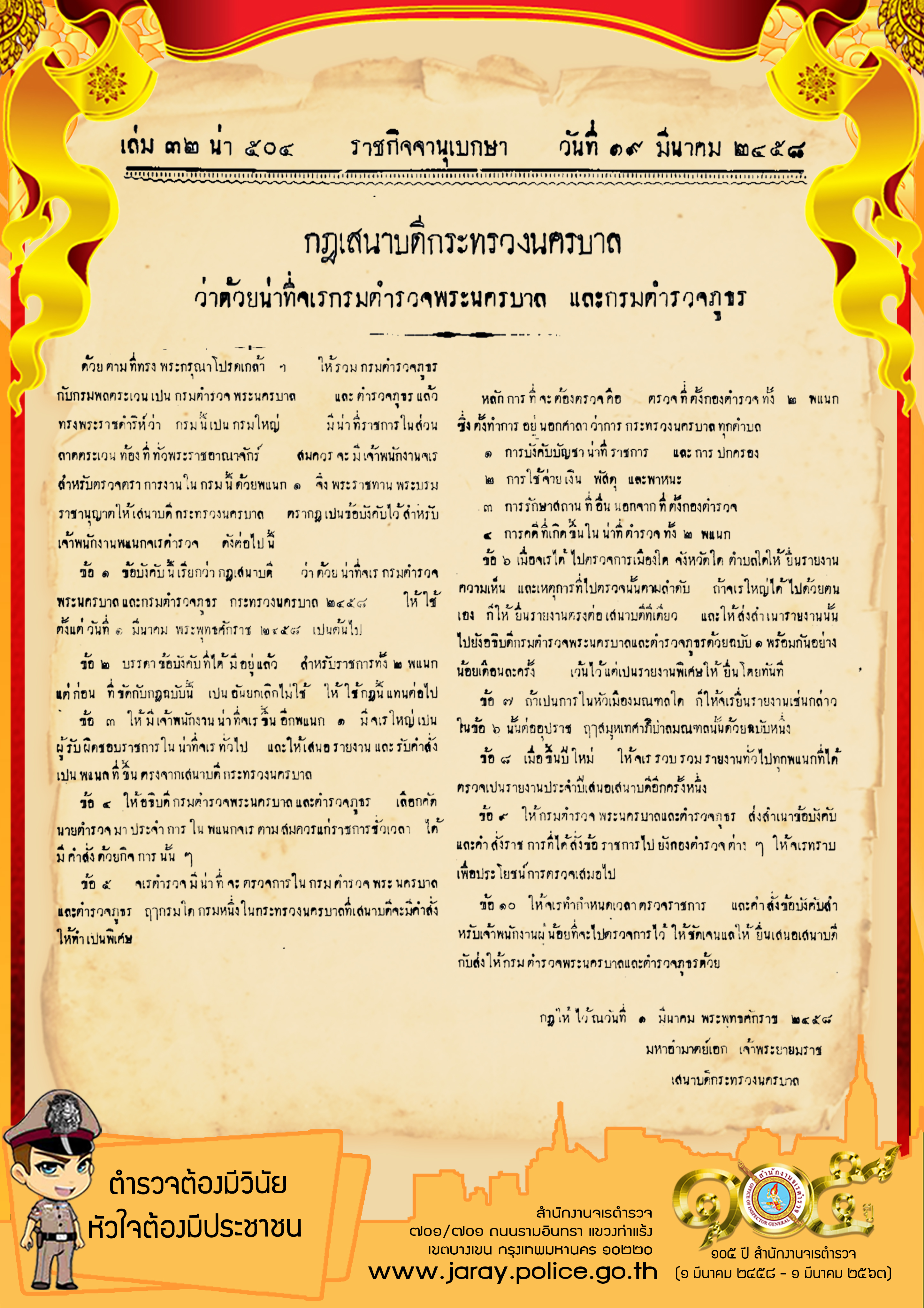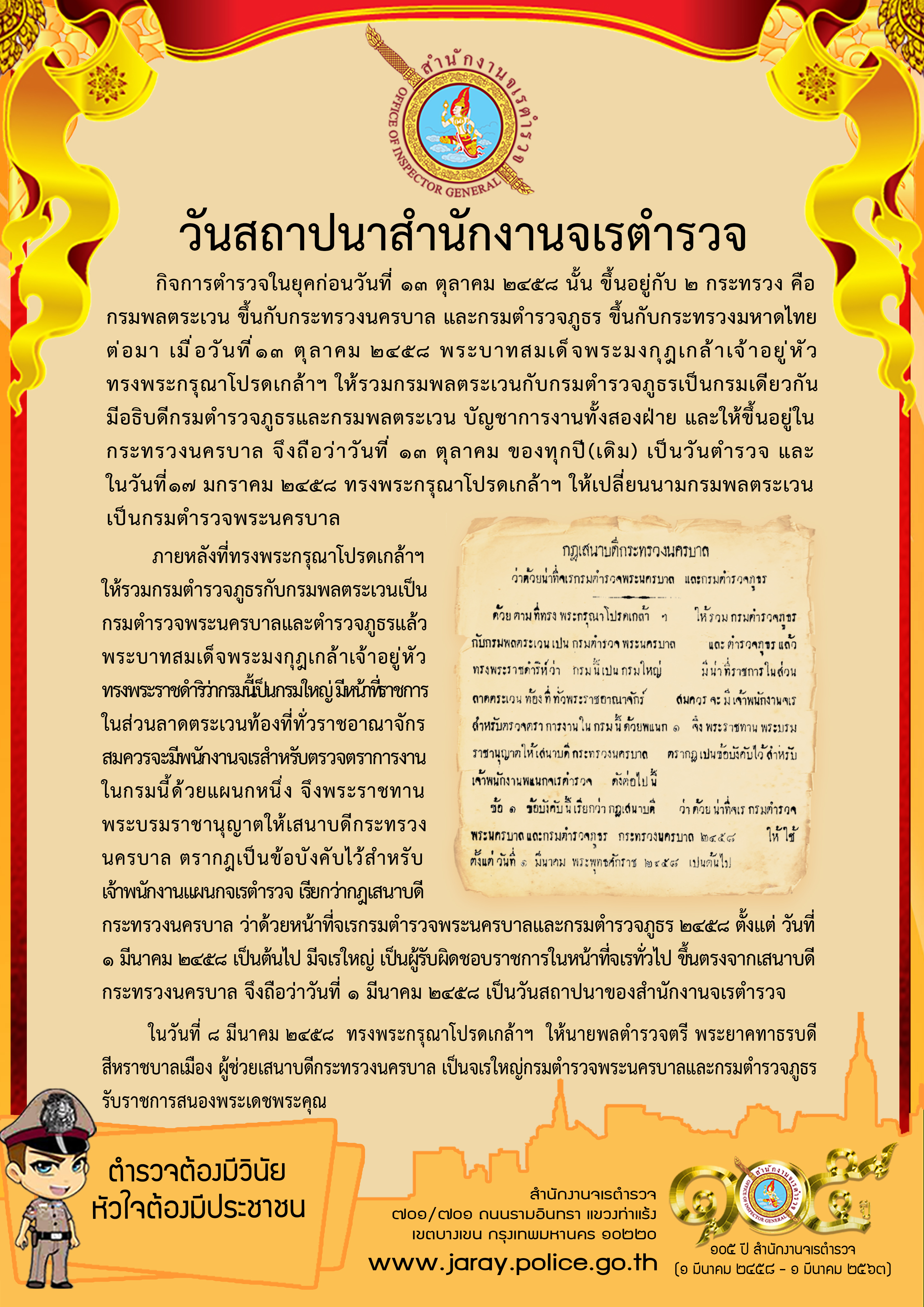 ภายหลังที่ทรงพระกรุณาโปรดเกล้าฯ ให้รวมกรมตำรวจภูธรกับกรมพลตระเวนเป็นกรมตำรวจพระนครบาลและตำรวจภูธรแล้ว พระบาทสมเด็จพระมงกุฎเกล้าเจ้าอยู่หัว ทรงพระราชดำริว่ากรมนี้เป็นกรมใหญ่ มีหน้าที่ราชการ ในส่วนลาดตระเวนท้องที่ทั่วราชอาณาจักร สมควรจะมีพนักงานจเรสำหรับตรวจตราการงานในกรมนี้ด้วยแผนกหนึ่ง จึงพระราชทาน พระบรมราชานุญาต ให้เสนาบดีกระทรวงนครบาล ตรากฎเป็นข้อบังคับไว้สำหรับเจ้าพนักงานแผนกจเรตำรวจ เรียกว่ากฎเสนาบดีกระทรวงนครบาล ว่าด้วยหน้าที่จเรกรมตำรวจพระนครบาลและกรมตำรวจภูธร ๒๔๕๘ ตั้งแต่ วันที่ ๑ มีนาคม ๒๔๕๘ เป็นต้นไป มีจเรใหญ่ เป็นผู้รับผิดชอบราชการในหน้าที่จเรทั่วไป ขึ้นตรงจากเสนาบดีกระทรวงนครบาล จึงถือว่าวันที่ ๑ มีนาคม ๒๔๕๘ เป็นวันสถาปนาของสำนักงานจเรตำรวจ