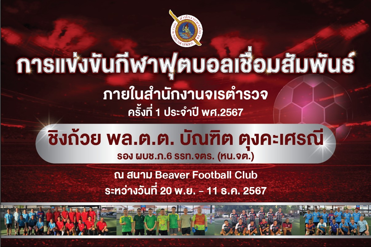การแข่งขันกีฬาฟุตบอลเชื่อมสัมพันธ์ภายในสำนักงานจเรตำรวจ ครั้งที่ 1 ประจำปี พ.ศ. 2567 ชิงถ้วยรางวัลจาก พล.ต.ต.บัณฑิต ตุงคะเศรณี รอง ผบช.ภ.6 รรท.จตร.(หน.จต.) ณ.สนาม Beaver Football Club