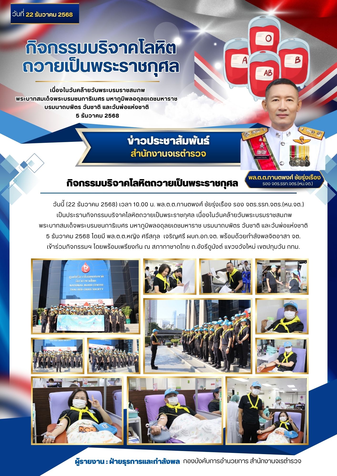 วันที่ 22 ธันวาคม 2568 เวลา 10.00 น. พล.ต.ต.กานตพงศ์ ชัยรุ่งเรือง รอง จตร.รรท.จตร.(หน.จต.) เป็นประธานกิจกรรมบริจาคโลหิตถวายเป็นพระราชกุศล เนื่องในวันคล้ายวันพระราชสมภพ พระบาทสมเด็จพระบรมชนกาธิเบศร์ มาหาภูมิพลอดุลยเดชมหาราช บรมนาถบพิตร วันชาติ และวันพ่อแห่งชาติ 5 ธันวาคม 2568 โดยมี พล.ต.ต.หญิง ศรีสกุล เจริญศรี ผบก.อก.จต. พร้อมด้วยกำลังพลจิตอาสา จต. เข้าร่วมกิจกรรมฯ โดยพร้อมเพรียงกัน ณ สภากาชาดไทย ถ.อังรีดูนังต์ แขวงวังใหม่ เขตปทุมวัน กทม.