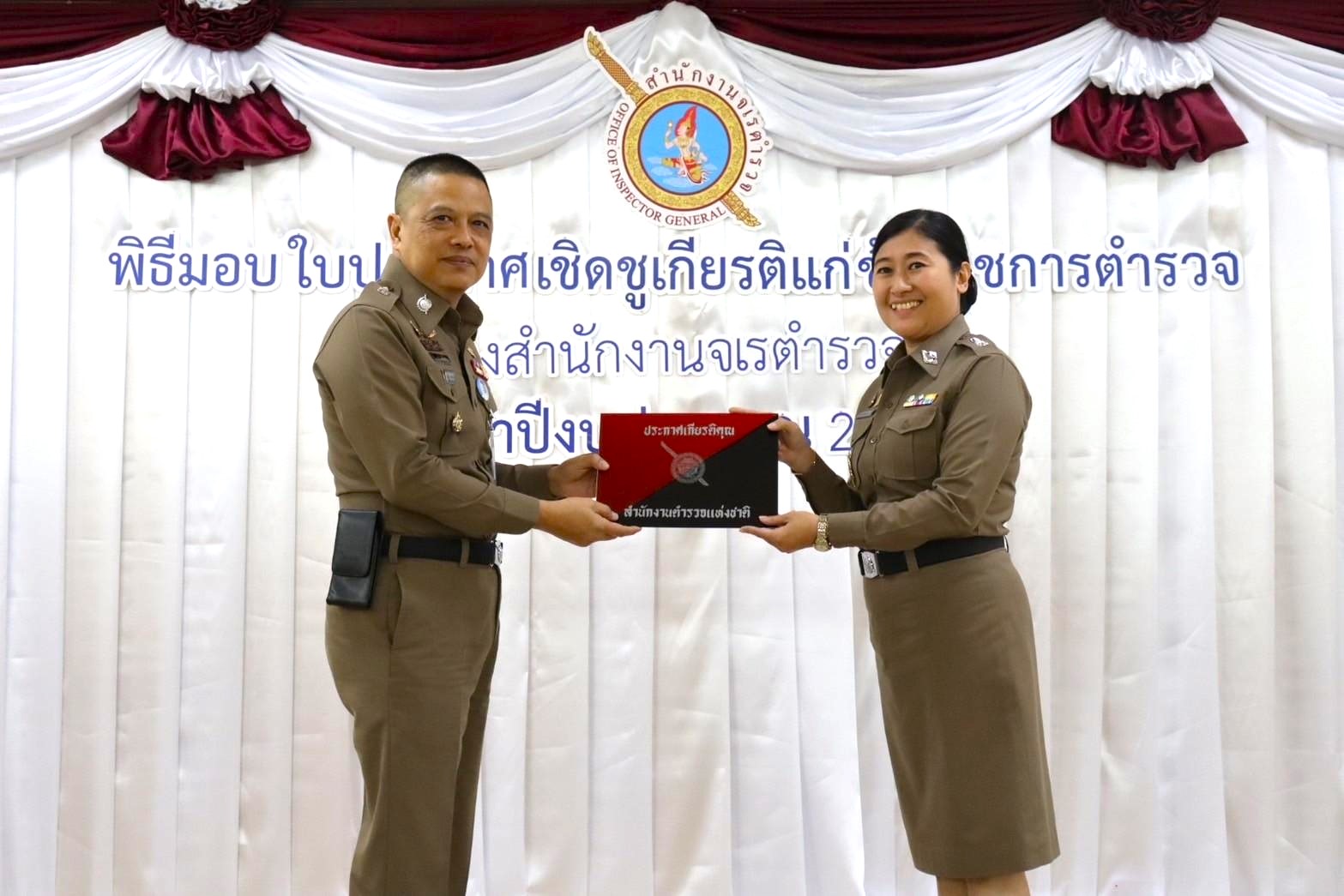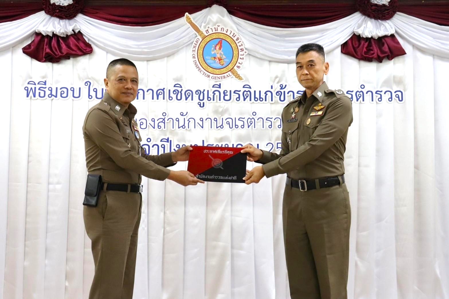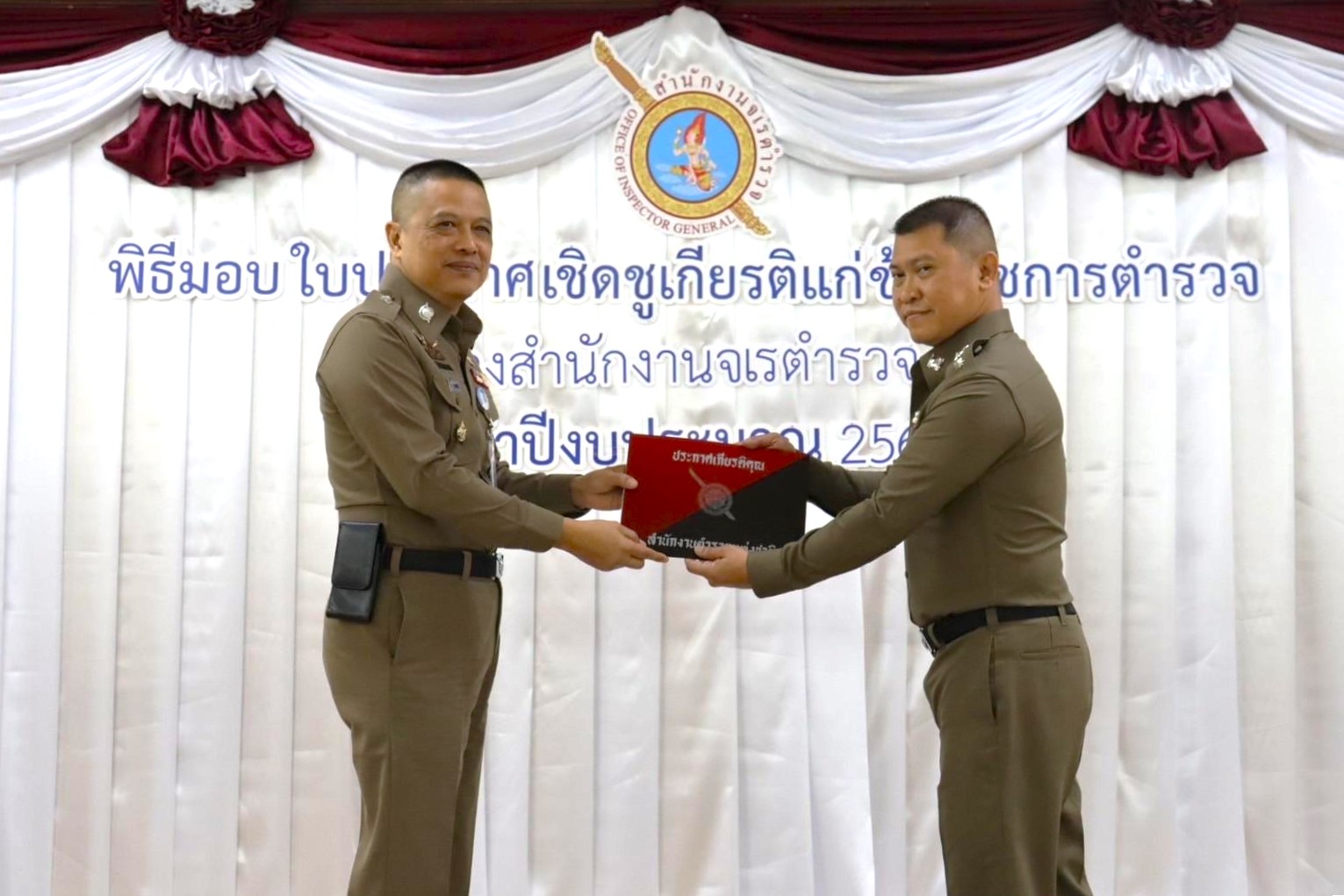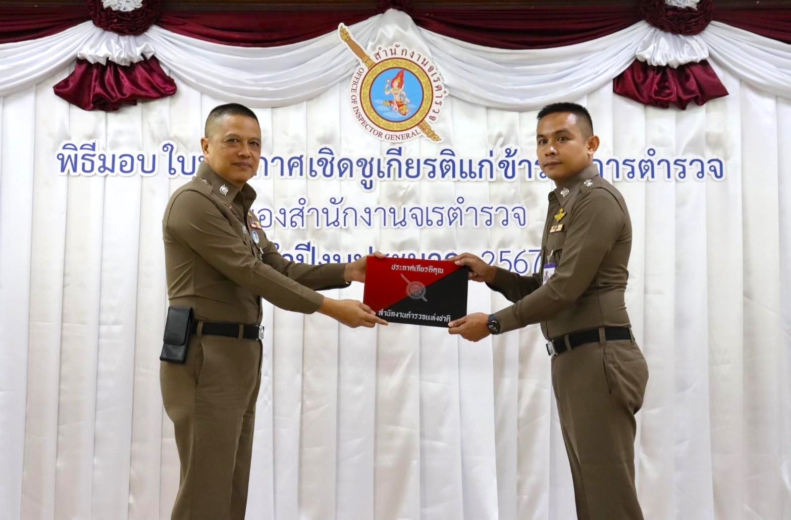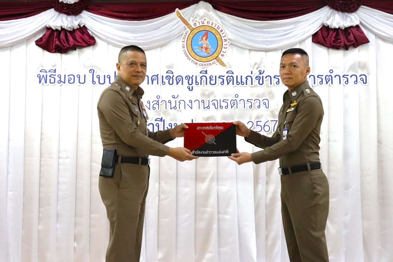 วันที่ 14 พฤศจิกายน พ.ศ.2567 พลตำรวจโท ธนพล ศรีโสภา จเรตำรวจ(หัวหน้าจเรตำรวจ) ได้ให้เกียรติเป็นประธานในพิธีมอบใบประกาศเชิดชูเกียรติแก่ข้าราชการตำรวจในสังกัดสำนักงานจเรตำรวจ ที่ประพฤติปฏิบัติดีเยี่ยมตามประมวลจริยธรรมและจรรยาบรรณของตำรวจ สมควรได้รับการยกย่องเชิดชูเกียรติเพื่อเป็นแบบอย่างที่ดี ประจำปีงบประมาณ พ.ศ.2567 ณ ห้องประชุมชั้น 4 สำนักงานตรวจสอบภายใน สำนักงานตำรวจแห่งชาติ