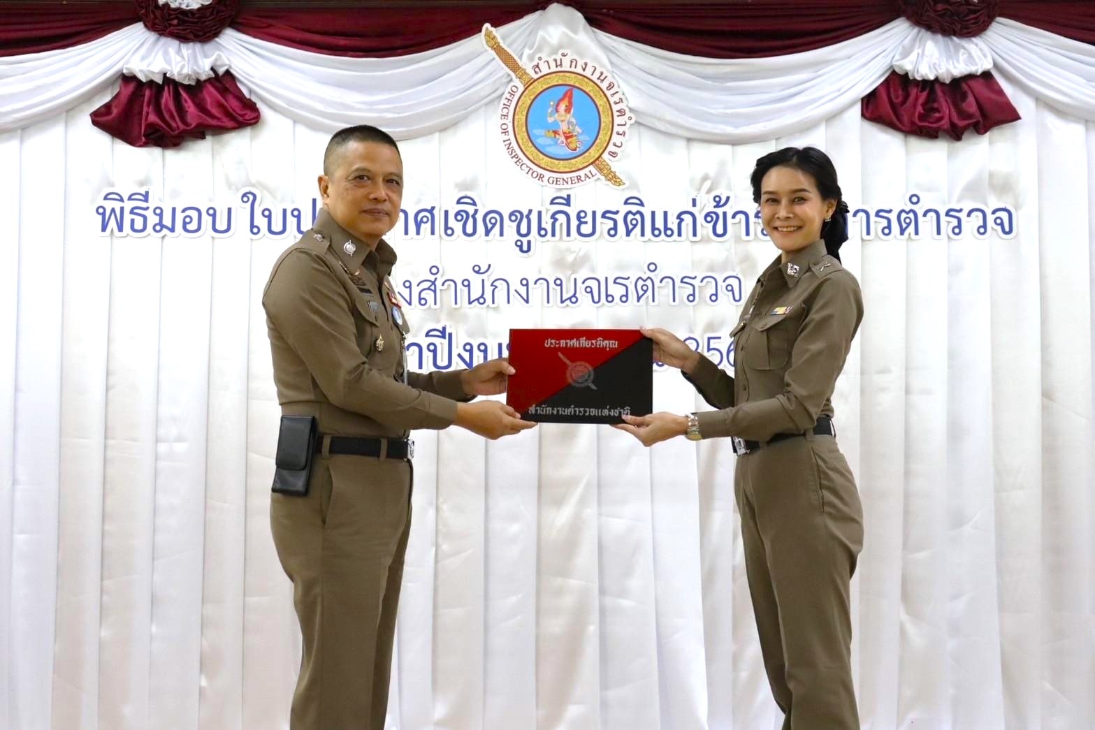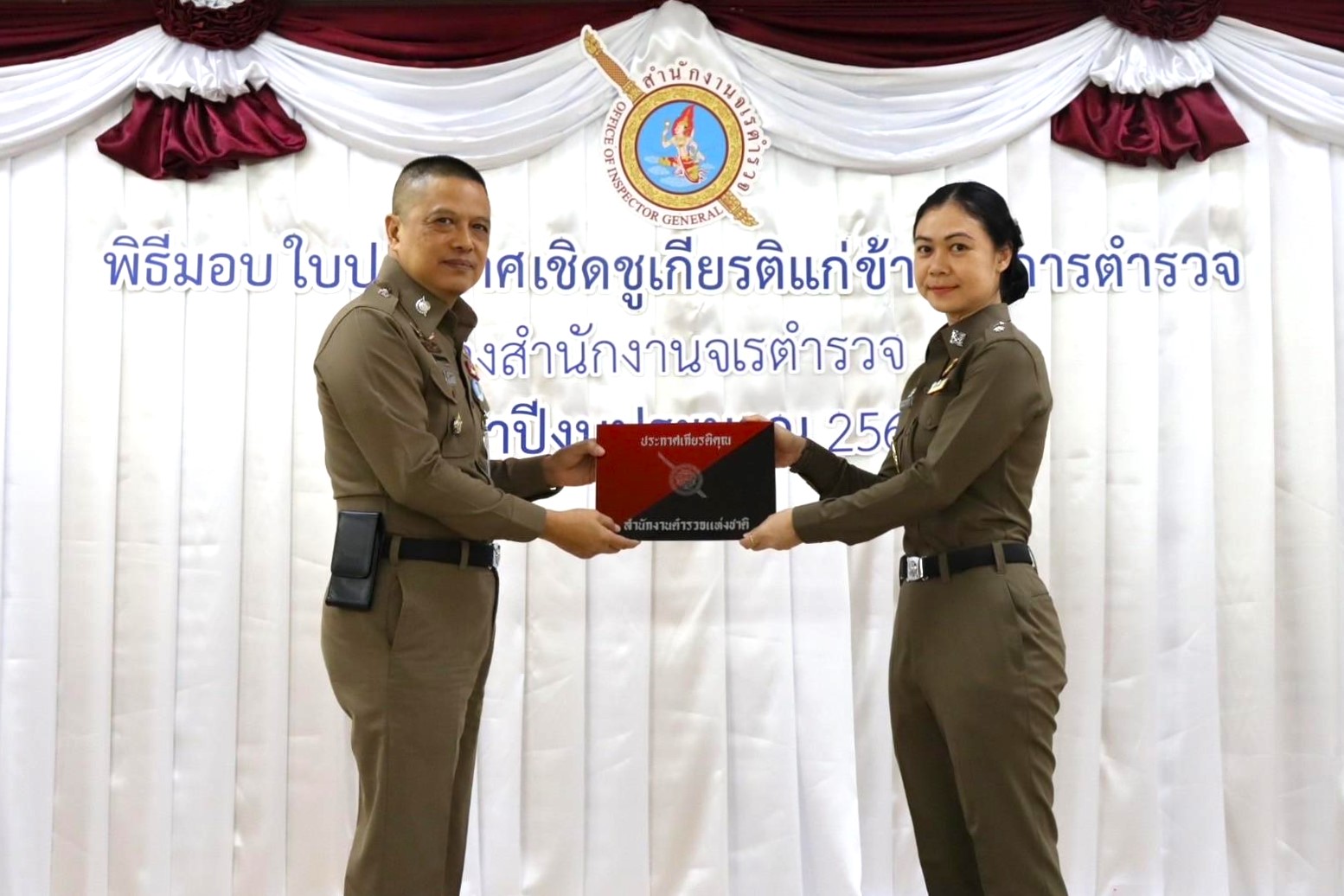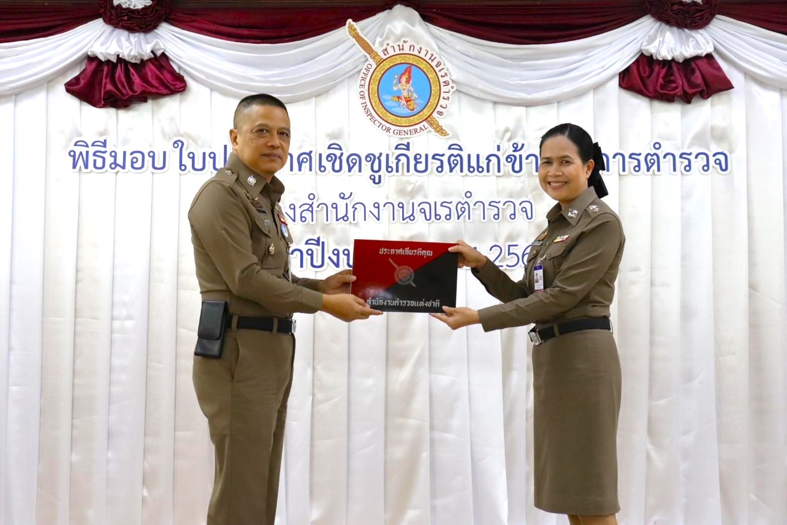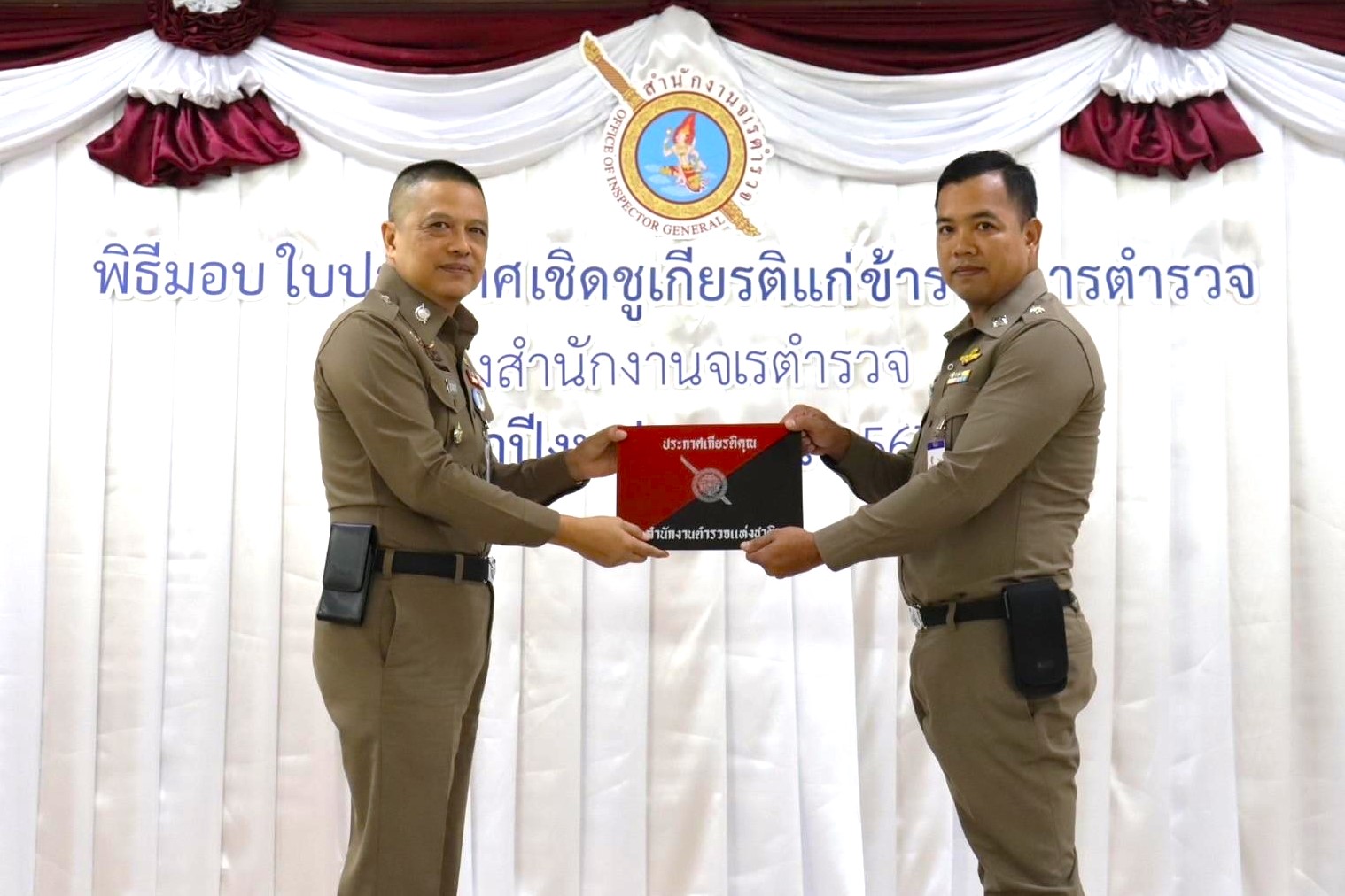 วันที่ 14 พฤศจิกายน พ.ศ.2567 พลตำรวจโท ธนพล ศรีโสภา จเรตำรวจ(หัวหน้าจเรตำรวจ) ได้ให้เกียรติเป็นประธานในพิธีมอบใบประกาศเชิดชูเกียรติแก่ข้าราชการตำรวจในสังกัดสำนักงานจเรตำรวจ ที่ประพฤติปฏิบัติดีเยี่ยมตามประมวลจริยธรรมและจรรยาบรรณของตำรวจ สมควรได้รับการยกย่องเชิดชูเกียรติเพื่อเป็นแบบอย่างที่ดี ประจำปีงบประมาณ พ.ศ.2567 ณ ห้องประชุมชั้น 4 สำนักงานตรวจสอบภายใน สำนักงานตำรวจแห่งชาติ