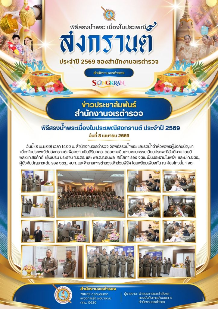 พิธีสรงน้ำพระและรดน้ำขอพรผู้บังคับบัญชา 8 เมษายน 2569 โดย admin / ข่าวประชาสัมพันธ์,ข่าวกิจกรรม,ข่าวประชาสัมพันธ์ Post Views: 64 วันนี้ (8 เม.ย.69) เวลา 14.00 น. สำนักงานจเรตำรวจ จัดพิธีสรงน้ำพระ และรดน้ำขอพรผู้บังคับบัญชา เนื่องในประเพณีวันสงกรานต์ เพื่อความเป็นสิริมงคล ตลอดจนสืบสานขนบธรรมเนียมประเพณีอันดีงาม โดยมี พล.ต.ท.สรศักดิ์ เย็นเปรม ประธาน ก.ร.ตร. และ พล.ต.ท.ธนาพล ศรีโสภา รอง จตช. เป็นประธานพิธีฯ และมี ก.ร.ตร. ผู้บังคับบัญชาระดับ รอง จตร., ผบก. และข้าราชการตำรวจในสังกัด เข้าร่วมเพื่อขอพร บริเวณห้องโถงชั้น 1 จต. Facebook iconFacebookTwitter iconTwitterLINE iconLine