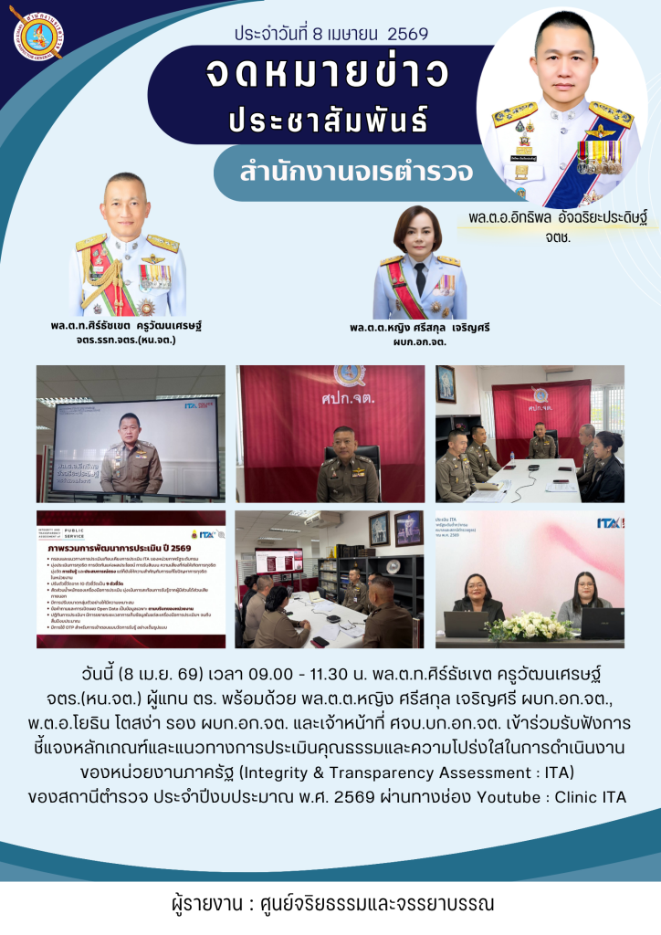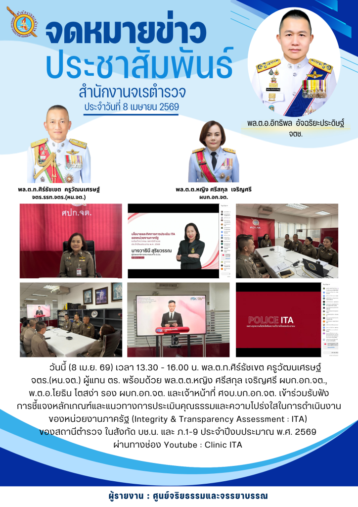 ด้วย สำนักงาน ป.ป.ช. ได้ดำเนินการจัดกิจกรรมชี้แจงการประเมินคุณธรรมและความโปร่งใสในการดำเนินงาน ของหน่วยงานภาครัฐ (Integrity & Transparency Assessment : ITA) ของสถานีตำรวจ ประจำปีงบประมาณ พ.ศ.2569 โดยมีวัตถุประสงค์เพื่อชี้แจงปฏิทิน หลักเกณฑ์ และกรอบแนวทางการประเมินฯ ให้แก่หน่วยงานในสังกัด ตร. ที่เข้าร่วมการประเมินฯ ได้รับทราบ ในวันพุธที่ 8 เม.ย. 69 เวลา 09.0๐-16.00 น. เป็นต้นไป ในรูปแบบออนไลน์ ผ่านทาง YouTube : Clinic ITA