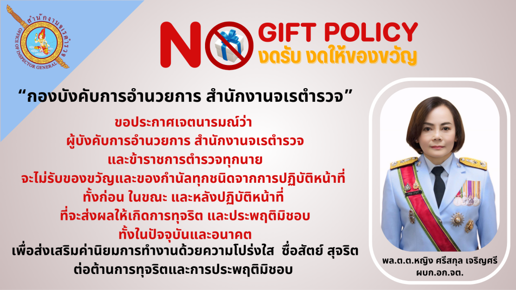 - ประกาศเจตนารมณ์ที่จะไม่รับของขวัญหรือของกำนัลทุกชนิดจากการปฏิบัติหน้าที่ (No Gift Policy) ลงวันที่ 3 กุมภาพันธ์ 2565