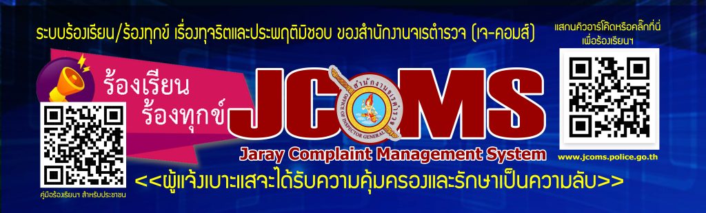 ระบบร้องเรียน/ร้องทุกข์ เรื่องทุจริตและประพฤติมิชอบ ของสำนักงานจเรตำรวจ (เจ-คอมส์) 10 ตุลาคม 2565 โดย admin / ไม่มีหมวดหมู่ Post Views: 45,828 Jaray Complaint Management System (JCoMS)คือ ระบบรับเรื่องร้องเรียน ร้องทุกข์ เรื่องทุจริตและประพฤติมิชอบของสำนักงานจเรตำรวจ ผ่านช่องทางเว็บไซต์http://www.jcoms.police.go.th คลิกที่นี่ เพื่อร้องเรียน “ผู้แจ้งเบาะแสจะได้รับความคุ้มครองและรักษาเป็นความลับ” คำสั่งที่เกี่ยวข้อง ช่องทางการร้องเรียนเรื่องทุจริตและประพฤติมิชอบและร้องทุกข์แจ้งเบาะแส Facebook iconFacebookTwitter iconTwitterLINE iconLine